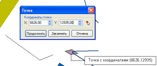 Если следующую узловую точку тоже нужно вводить по координатам, то надо нажатье кнопку Продолжить. Тогда очередной сегмент будет построен, но окно закрыто не будет, и можно будет задать следующую точку.
