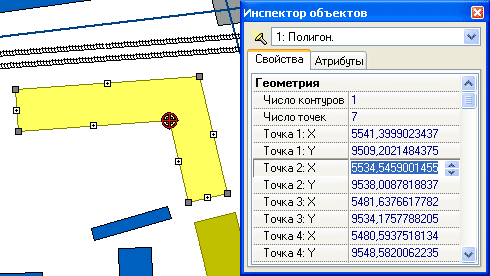 Перемещая узловые точки с помощью мыши, можно указать только их приблизительное положение на карте. Задавать точные координаты узловых точек можно в специальном окне «Инспектор объектов». Оно предназначено для редактирования геометрических и атрибутивных значений графических объектов на карте. Что воспользоваться инспектором, нужно включить режим