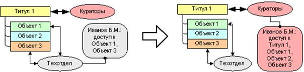 Права доступа устанавливаются для групп, но не для отдельных пользователей. Смысл такого подхода заключается в следующем. Группы символизируют роли, которые их члены играют в информационном обмене. Конкретные лица (пользователи) могут меняться, переходить из одной роли в другую. При этом автоматически будет изменяться уровень доступа этих пользователей к объектам системы. Например, пользователь «» находился в группе «Техотдел», и в соответствии с правами этой группы имел доступ к «Объекту 1» и «Объекту 3». Затем в силу изменения статуса он был переведен в группу «Кураторы». Теперь, в соответствии с правами этой группы он автоматически имеет доступ к «Титулу 1» в целом, и к «Объекту 1», «Объекту 2» и «Объекту 3» в частности (рис. 9.39).