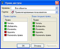 Права доступа. Появится окно «Права доступа» (рис. 9.41). Здесь можно выбрать уровень, на котором назначаются права, и группу, которой назначаются права. Список назначенных на данном уровне прав выводится слева; справа располагается список ваших собственных прав на данном уровне. Следует отметить, что если у вас нет прав назначать права другим группам, список слева будет неактивен. Для того, чтобы изменить какое-либо право выбранной группы, следует нажать на соответствующий квадратик в левом списке. При этом право изменится: