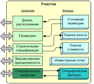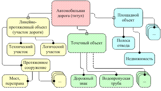 Автомобильная дорога состоит из объектов трех видов: протяженных (участков), точечных и площадных. Под участком или объектом будем понимать такое сооружение или протяженный фрагмент дороги, логический или технический, который исполняет определенный набор функций, либо представляется в определенном качестве, может фигурировать в этом качестве как единое целое, и при этом может быть целиком заменен на аналогичный. Необходимым требованием к участку и объекту является его необходимость с информационно-аналитической точки зрения. Так, например, в ряде практических случаев представляется важным рассматривать такие мелкие объекты, как слои дорожной одежды, детали пролета моста, а в ряде случаев – нет.