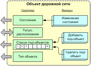 Мы уже выделили примерную структуру объектной иерархии, и теперь можем привести общие положения по разделению конкретных сущностей по этим классам. Начиная с самого верха, выделим абстрактный объект дорожной сети. Самыми общими его чертами будут: принадлежность титулу, расположение, тип (принадлежность к тому или иному виду сущностей), состояние. Набор возможных состояний будет расширяться по мере конкретизации описания объекта, список объектов, находящихся в его составе. Самыми общими функциями будут: изменение состояния объекта, добавление нового объекта в состав данного, исключение определенного объекта из состава (рис. 9.43).