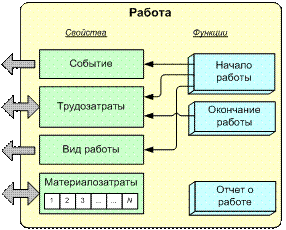Фактически событие состоит из работ. Это могут быть ремонтно-восстановительные работы, работы по содержанию, работы по измерению параметров и т. п. (рис. 9.46). Функция «Окончание работы» может вызвать функции «Обнаружение дефекта» и «Устранение дефекта» у события, в составе которого происходит работа. Функции «Начало работы» и «Окончание работы» вызываются из функции события «Выполнение работы».