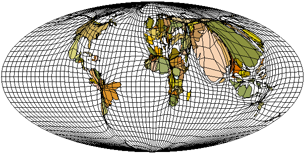 Например, если в качестве выравнивающего параметра выбрать плотность населения, то наиболее плотно населенные районы увеличатся в размерах, а менее населенные – уменьшатся. Такие изображения называются эквидемическими. На рис. 3.45 приведен пример анаморфированного изображения стран мира по населению.