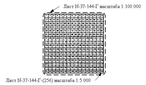 частей – карт масштаба 1:5 000 (обозначаемыми в виде NГ-(256) – в конце добавляется в скобках арабскими цифрами номер листа; рис. 3.54), а каждый лист масштаба 1:5 000 делится на