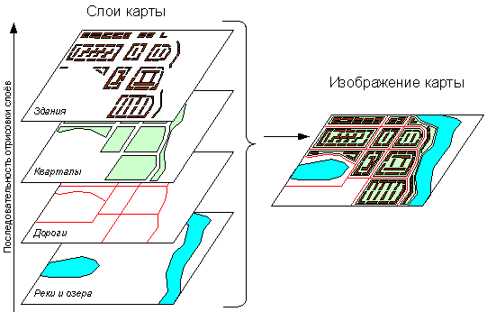 Электронная карта состоит из упорядоченной совокупности графических слоёв карты, которые последовательно отображаются на экране компьютера (рис. 4.1). В случае необходимости некоторые слои карты могут быть временно отключены, чтобы не мешать просмотру остальных.