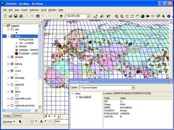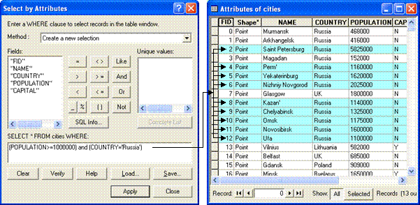 Ещё одним отличием электронных карт от бумажных аналогов является наличие в ГИС развитых функций поиска пространственных объектов на карте в соответствии с некоторыми условиями, налагаемыми на их атрибуты. Обычно это выглядит как написание некоторого запроса на специальной упрощенной версии языка SQL. На рис. 4.9 показан пример запроса, заданного в среде ArcGIS. Этот запрос находит все города на карте мира, которые имеют население не менее 1 миллиона человек и находятся в России. Результаты выделяются в таблице и на карте.