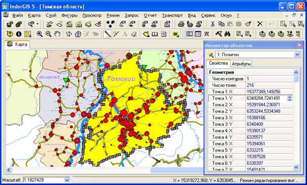 В других ГИС аналогичным способом можно получить не только атрибутивную информацию по объектам, но и геометрическую, а также сразу отредактировать соответствующие значения. Например, в ГИС IndorGIS при выделении объекта вся информация о нём (геометрическая и атрибутивная) отображается в инспекторе объектов, с помощью которого можно просмотреть информацию по объектам и изменить её (на рис. 4.8 в окне инспектора объектов представлена геометрическая информация о районе в Томской области, находящегося в центре карты).