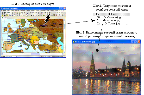 При выполнении горячей связи у выбранного объекта на карте берётся значение атрибута, используемого для установления горячей связи. Затем это значение передается в процедуру выполнения горячей связи некоторого вида. На рис. 4.10 показан пример вызова горячей связи для показа изображения, ассоциированного с указанным на карте городом.