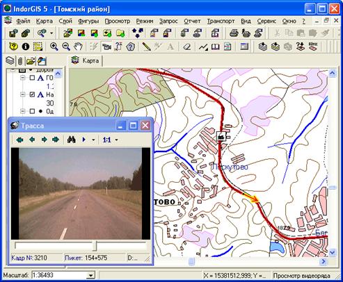 В IndorGIS для работы с видеорядами предусмотрен специальный режим работы с картой. В этом режиме можно выделить некоторую линию (ось дороги) на карте и привязать к этой линии видеоряд, указав имя файла видеоряда и параметры пикетажной привязки видеоряда. После того, как видеоряды привязаны, можно просто указать точку на линии, а ГИС покажет в отдельном окне соответствующий фотоснимок из автомобиля. Перемещение курсора по карте в ГИС будет автоматически вызывать смену кадров в окне просмотра видеоряда (рис. 4.12).