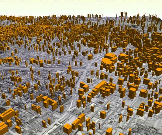 3. Векторные данные, которые путем выдавливания по вертикали приобретают объемный вид. Например, слой зданий, представленный в виде полигонов, путём выдавливания вверх на некоторую высоту (в зависимости от значений атрибутов) приобретает вид многогранников. Стороны этих зданий могут быть окрашены одним цветом, либо на них можно нанести текстуру (рис. 5.28).