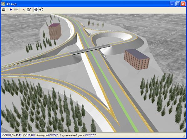 Рис. 5.29. Трехмерное изображение местности с дорогой, зданиями,