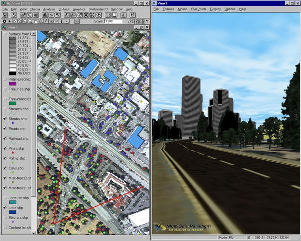 SiteBuilder 3D по обычным (плоским) данным в ГИС самостоятельно создаёт необходимую ВММ с дополнительными структурами данных, позволяющими выполнять визуализацию трехмерных карт в реальном режиме времени. На рис. 5.30 приведён пример ВММ, построенного с помощью SiteBuilder 3D на основе карты в ArcView GIS 3.2. В левой части экрана показана исходная двумерная карта, в правой части – соответствующее трехмерное изображение. Для удобства навигации в пространстве в левой части экрана двумя линиями показывается угол обзора.