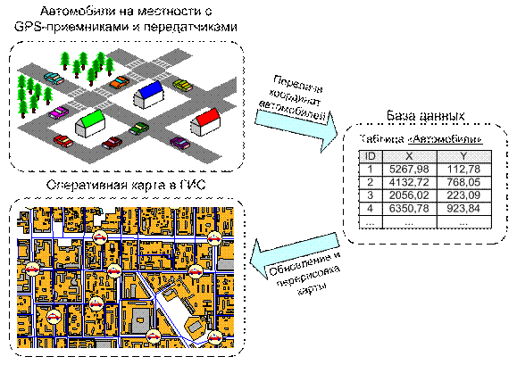 Типичным применением оперативных карт является отслеживание положения объектов, движущихся на местности. Это могут быть, например, автомобили оперативных служб, перемещающиеся по городу. Эти машины должны быть снабжены GPS-приемниками и периодически передавать информацию в некоторый компьютерный центр с уведомлением об изменении своего положения в пространстве. В этом центре информация о положении автомобилей должна сохраняться в базу данных. В свою очередь, ГИС должна периодически делать запросы к этой базе данных, извлекать оттуда информацию о положении автомобилей и перерисовывать карту с автомобилями (рис. 5.31).