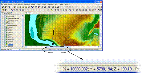 1. Определение координат точки на карте. Чтобы воспользоваться этой функцией в большинстве ГИС обычно не требуется переключаться в какой-то специальный режим работы. При перемещении мышки по карте, в строке статуса обычно показываются координаты указанной курсором точки. При этом в строке статуса может отображаться и высотная отметка этой точки, если в ГИС некоторая поверхность выбрана в качестве текущей (рис. 6.1).