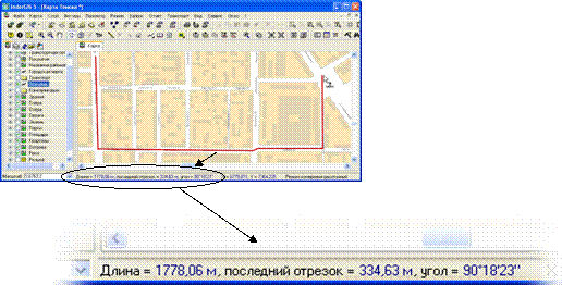 2. Измерение расстояний, азимутов и углов. Пользователь должен указать на карте в ГИС последовательность точек ломаной, длину которой надо вычислить. ГИС выводит в строке статуса общую длину ломаной, а также длину последнего сегмента ломаной. Кроме того, для последнего сегмента может выводиться азимут и угол поворота относительно предыдущего сегмента (рис. 6.2).