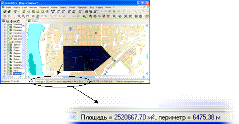 3. Измерение площадей и периметров. Как и в предыдущем способе, пользователь должен задать в ГИС вершины некоторого многоугольника. При этом в строке статуса ГИС будет выводиться площадь и периметр (рис. 6.3).