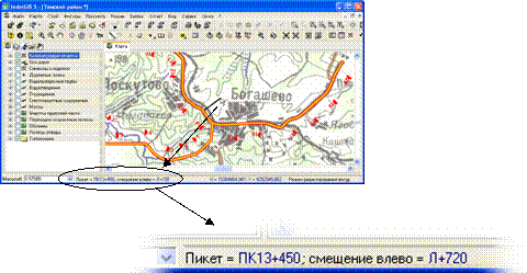 5. Измерение линейных координат (пикета и смещения) точки относительно трассы. В этом режиме пользователь должен указать некоторую линию, относительно которой производится определение линейных координат. Далее, перемещая курсор мышки по карте, в строке статуса ГИС будет выводиться пикет и смещение указанной точки (рис. 6.4).