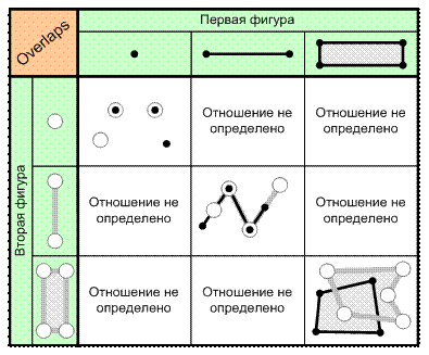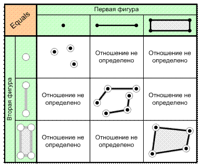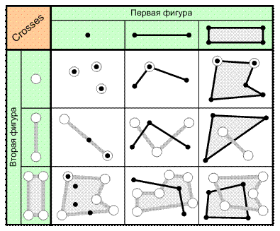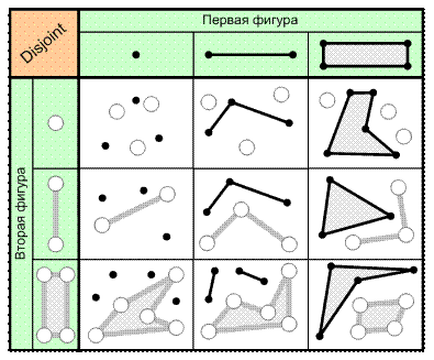 Всего выделяют 8 основных видов бинарных отношений между пространственными объектами. Далее мы их рассмотрим, а для каждого из них будут приведем рисунки, комментирующие их для 3 основных типов (в зависимости от размерности) векторных данных: точечных (0-мерных), линейных (1-мерных) и площадных (2-мерных). Для некоторых сочетаний типов фигур описываемые операции не имеют смысла, о чем указывается на рисунках.
