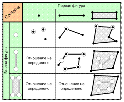 2. Отношение «Содержит в себе» (Contains). Две фигуры находятся в этом отношении, если вторая фигура находится внутри первой, при этом ни одна точка второй фигуры не должна находиться вне первой (рис. 6.6). Отношение не определено в случае, когда вторая фигур имеет большую размерность, чем первая.