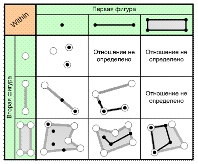 3. Отношение «Содержится в» (Within, Inside). Две фигуры находятся в этом отношении, если первая фигура находится внутри второй, при этом ни одна точка первой фигуры не должна находиться вне второй (рис. 6.7). Отношение не определено в случае, когда вторая фигур имеет меньшую размерность, чем первая. По сути, это отношение является обратным по отношению к предыдущему («Содержит в себе»), т. е. надо только поменять местами аргументы отношения.