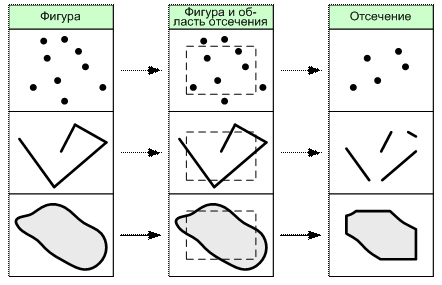 На рис. 6.13 приведён пример выполнения операции отсечения для фигур различного вида. В качестве примера 0-мерных (точечных) объектов используется мультиточка – фигура, состоящая из нескольких точек.
