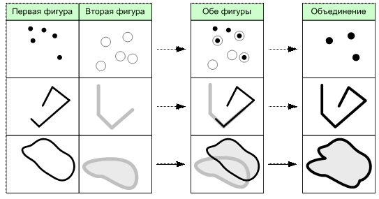 Результатом операции объединения двух пространственных объектов является объект, состоящий из всех точек плоскости, которые принадлежат хотя бы одному исходному объекту (рис. 6.15).