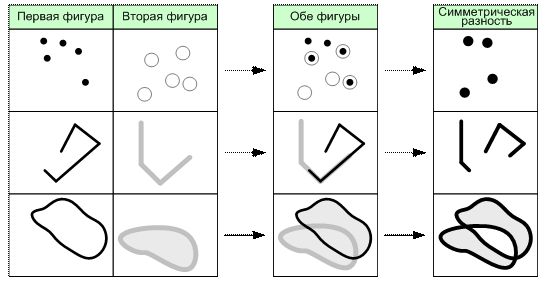 Результатом операции симметрической разности двух объектов является объект, состоящий из всех точек плоскости, которые принадлежат первому или второму объекту, но обоим сразу (рис. 6.18).