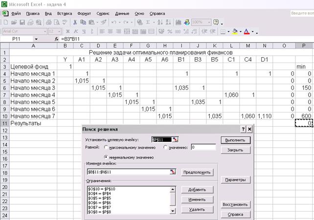 Таблица исходных данных и форма Поиск решения в Microsoft Excel: