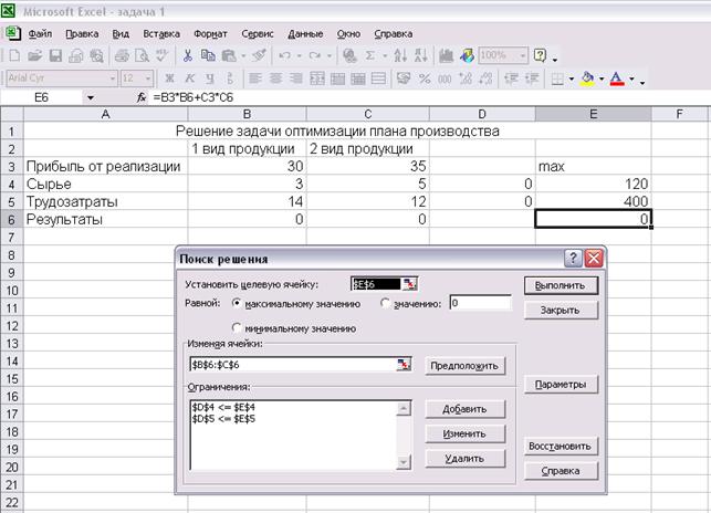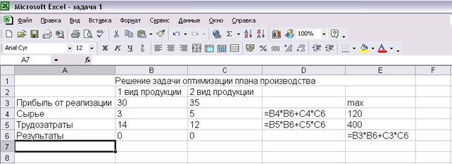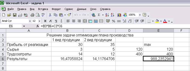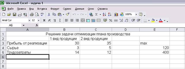 Добавим в таблицу еще одну строку (например, строку 6), в которую будут вноситься получаемые в ходе решения результаты. Объем выпуска продукции вида 1 будем предполагать получить в ячейке В6, продукции вида 2 - в ячейке С6, а искомую прибыль - в ячейке Е6.