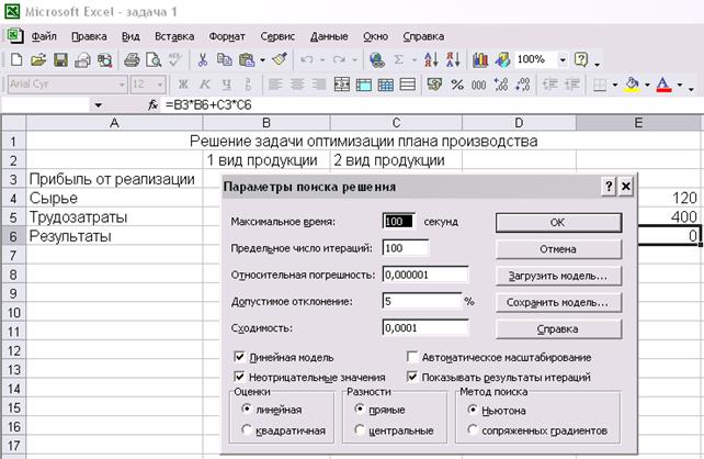 При необходимости, установив флажок Показывать результаты итераций в окне Параметры, можно приостанавливать процесс оптимизации после каждой итерации и просматривать ее результаты. Окно Параметры позволяет варьировать также максимальное время, предельное число итераций, относительную погрешность, допустимое отклонение, тип модели, метод поиска и т. д. Такая необходимость может возникнуть в случае, если по каким-либо причинам найти оптимальное значение целевой ячейки сразу не удается.
