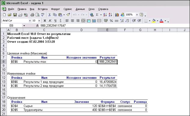 Отчет Результаты отражает исходные и результирующие значения целевой и влияющих ячеек, а также сведения о наложенных ограничениях.