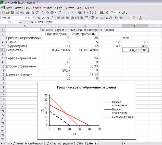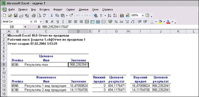 Отчет Пределы отражает наибольшее и наименьшее значения влияющей ячейки при фиксированных и удовлетворяющих всем ограничениям остальных.