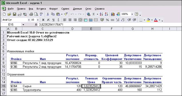 Отчет Устойчивость содержит информацию о двойственных оценках для каждого ограничения, а так же о границах устойчивости по значениям коэффициентов целевой функции и правых частей ограничений.