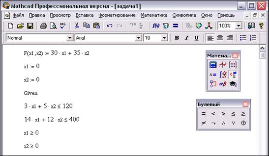 Для этого, запустив указанный программный продукт, необходимо в открывшемся окне документа набрать математическую модель задачи, которая для данного примера будет выглядеть так: