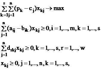 Выражение (1) является целевой функцией и отражает максимизацию прибыли предприятия от реализации продукции. Выражение (2) - система специальных ограничений, в данном случае - на фактически имеющиеся объемы ресурсов. Выражение (3) - система общих ограничений на неотрицательность переменных.