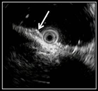 Эндосонография | Гипоэхогенное образование, исходящее из слизистого слоя и распространяющееся на подлежащие слои | Гипоэхогенное образование, исходящее из слизистого слоя и распространяющееся на подлежащие слои | Определяется в виде массивной гипоэхогенной опухолевой инфильтрации, исходящей из слизистого слоя и распространяющейся на подлежащие слои. |
