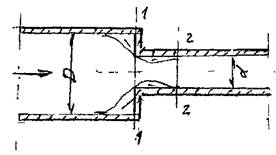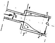 Внезапное сужение канала. При внезапном сужении канала поток жидкости отрывается от стенок входного участка и лишь затем (в сечении 2 - 2)касается стенок канала