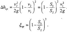 Таким образом, можно сказать, что потеря напора при внезапном расширении потока равна скоростному напору, соответствующему потерянной скорости.