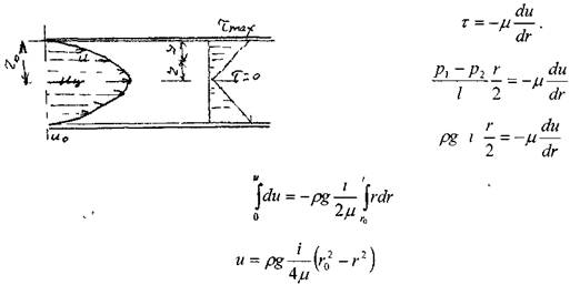 Таким образом, касательные напряжения по сечению трубы изменяются по линейному закону; в центре потока (на оси трубы) г=0 касательные напряжения т= 0.