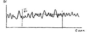 движении. С помощью термогидрометра, прибора позволяющего фиксировать изменение скорости в точке замера, можно снять кривую скорости. Если выбрать интервал времени достаточной продолжительности, то окажется, что колебания скорости наблюдаются около некоторого уровня и этот уровень сохраняется постоянным при выборе различных интервалов времени. Величина скорости в данной точке в данный момент времени носит название мгновенной скорости. График изменения мгновенной скорости во времени u(t) представлена на рисунке. Если выбрать на кривой скоростей некоторый интервал времени и провести интегрирование кривой скоростей, а затем найти среднюю величину, то такая величина носит название осреднённой скорости![]()