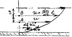 Теперь рассмотрим некоторую частицу жидкости находящуюся в точке А Пусть эта частица переместилась в соседний слой жидкости и углубилась в него на длину пути перемешивания, т. е. оказалась в точке В. Тогда расстояние между этими точками будет равно /. Если скорость жидкости в точке А будет равна и, тогда скорость в точке