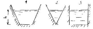 готовых элементов, когда водовод монтируется на трассе и обсаживаемые. При сооружении последних, как правило, предварительно сооружается земляное русло бедующего водовода (траншея, канава и др.), после чего такое русло обсаживается водоизоляционным материалом во избежание потерь при инфильтрации жидкости в почву. Наиболее часто встечающимися формами сечения таких водоводов являются водоводы трапециевидного (1), треугольного (2) и, реже всего, прямоугольного форм сечения (3).