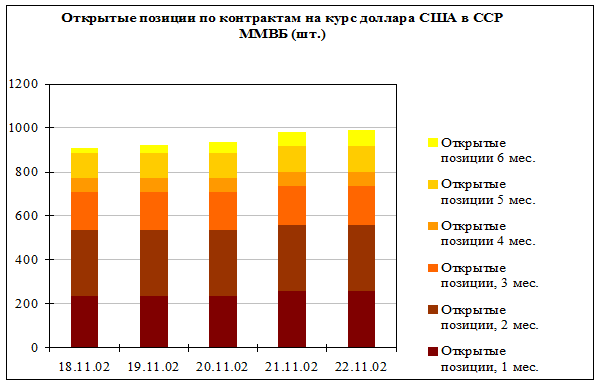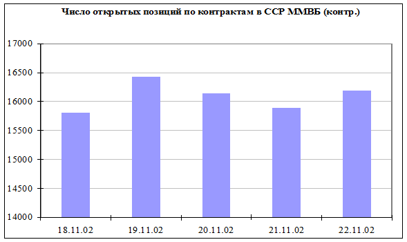 Число открытых позиций на конец недели составило 993 контракта, что несколько превышает показатель пятницы 15.11.02 (в конце прошлой недели количество открытых позиций составило 883 контракта).