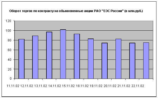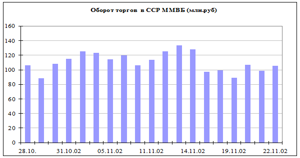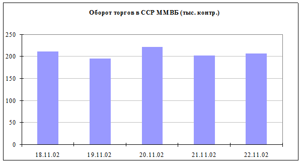Общий оборот рынка за период с 18 ноября по 22 ноября 2002 г. составил 500 млн. руб. - что на 98 млн. руб. ниже оборотов предыдущего периода. Среднедневной оборот рынка срочных контрактов составил 99,51млн. руб.