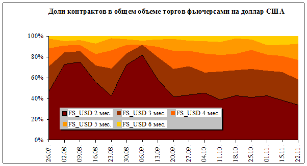 В период с 18 по 22 ноября оборот на рынке фьючерсов на доллар США понизился на 33,6 % и составил 95,72 млн. руб. при среднедневном обороте 19,14 млн. рублей.