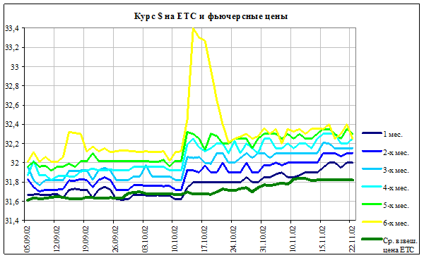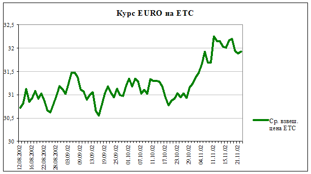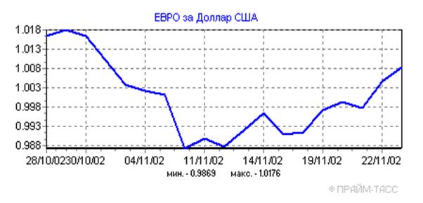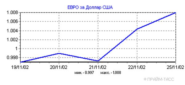 Прошедшая неделя характеризовалась стабилизацией курса доллара. Курс доллара США на ЕТС за прошедшую неделю не претерпел заметных изменений. В понедельник 18.11.02 курс составил 31,8231 руб./доллар. Этот же показатель задержался на отметке в 31,8222 руб./доллар в пятницу 22.11.02. При этом:
