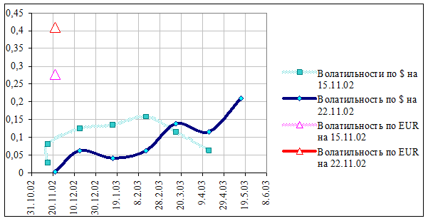 На диаграмме 11 представлены значения недельной волатильности курса доллара и евро на ЕТС, а так же волатильности цен контрактов на доллар США соответственно при 5-ти дневном усреднении.