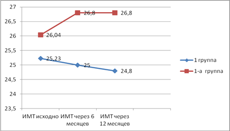3,5+1,3кг в постменопаузе); ОТ уменьшилась в среднем на 6,5+1,3 см в пременопаузе, на 5,3+1,4 см в постменопаузе; ИМТ уменьшился на 0,43 кг/м2 в пременопаузе, на 7 кг/м2 (6,22%) (р<0,05).