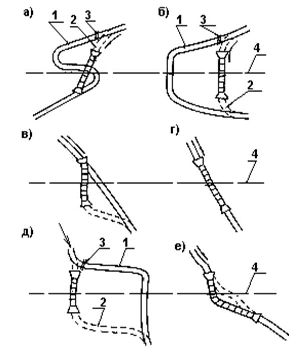 а, б – изменение русла для улучшения расположения трубы; в - неудовлетворительное расположение трубы; г, е - правильное расположение трубы; д - прохождение потока через трубу с помехами у входного оголовка; 1- старое русло; 2- новое русло; 3- перемычка; 4- ось насыпи. |